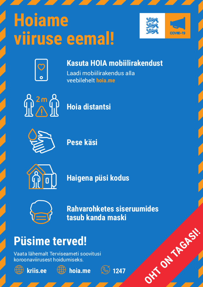 | Kehtivad piirangud | COVID-19 sümptomid ja käitumisjuhised | RIIGI INFOTELEFONID | EL digitaalne COVID tõend | Vaktsineeri koroona vastu / Пройдите вакцинацию от коронавируса | Hoiame viiruse eemal! / Защитим себя от вируса! | OLE VALMIS