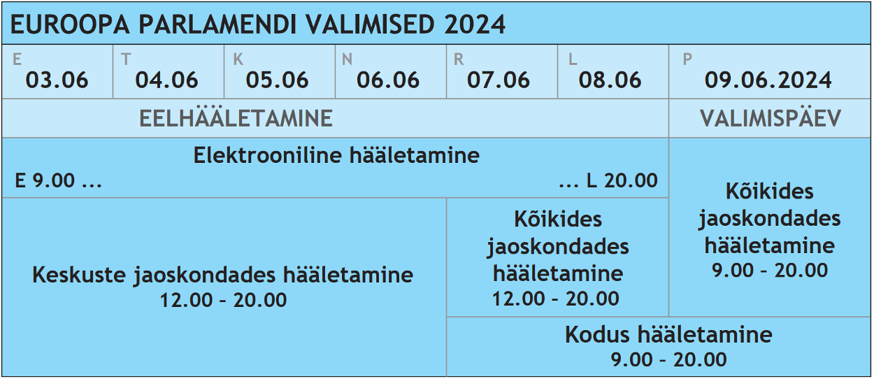 Eelhääletamine ja elektrooniline hääletamine kestab 3.–8. juunini. Eelhääletada saab kuue päeva jooksul igas vallas ja linnas vähemalt ühes valimisjaoskonnas kella 12-20. E-hääletamine kestab esmaspäevast kuni laupäeva õhtu kella 20 välja. E-hääle andmiseks on vaja arvutit, nutiseadmega e-häält anda ei saa. Arvutis omakorda peaks olema kõige uuem ID-kaardi tarkvara, operatsioonisüsteem ja viirusetõrje. Enda tuvastamiseks ja hääle kinnitamiseks on vaja kas ID-kaarti koos lugejaga või mobiil-ID-d. Ka nende kehtivus tasuks varakult üle kontrollida. Smart-ID neil valimistel veel enda tuvastamiseks kasutada ei saa, see võimalus lisandub järgmisteks, 2025. aasta kohalikeks valimisteks. Valijarakendus, millega e-hääletada, on kättesaadav veebilehelt valimised.ee, kust see tuleb oma arvutisse laadida. Rakendus on kättesaadav ainult valimised.ee lehelt, kuskilt mujalt seda kindlasti alla laadida ei tohiks.