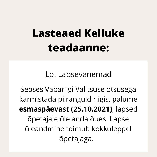 Lp. Lapsevanemad Seoses Vabariigi Valitsuse otsusega karmistada piiranguid riigis, palume esmaspäevast (25.10.2021), lapsed õpetajale üle anda õues. Lapse üleandmine toimub...