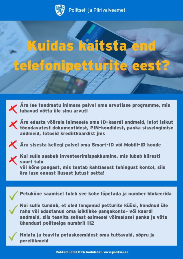 Politsei hoiatab: telefonikelmid kimbutavad Lääne-Virumaa elanikke Telefonipetturid on jätkuvalt aktiivsed, otsides aina uusi viise ohvrite usalduse võitmiseks. Käesoleva...