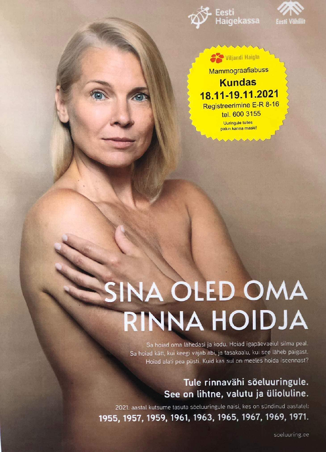 Koostöös Eesti Vähiliiduga teostab SA Viljandi Haigla rinnavähi sõeluuringut KUNDAS on uuring kuupäevadel: 18.11-19.11.2021 (asume Viru-Nigula...