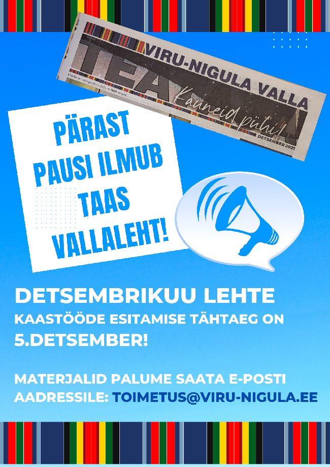 Viru-Nigula Vallavolikogu istung toimub neljapäeval, 21. detsembril 2023 algusega kell 15.30 Lammasmäe Puhkekeskuses Päevakord: Viru-Nigula valla 2023. aasta III lisaeelarve...