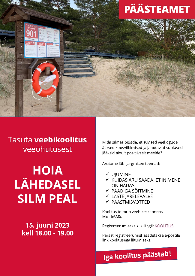 Päästeamet kutsub veeohutuse veebikoolitusele „HOIA LÄHEDASEL SILM PEAL" 15. JUUNIL KELL 18-19. Räägitakse järgmistel teemadel: UJUMINE; KUIDAS ARU SAADA, ET INIMENE ON HÄDAS;...