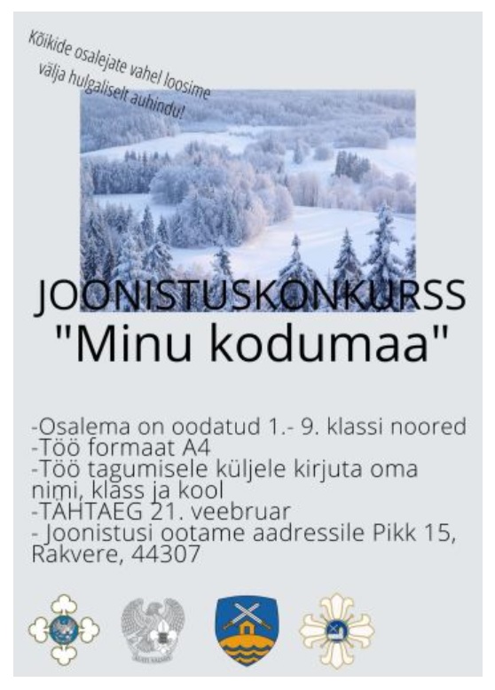 Kaitseliidu Viru malev kutsub 1.-9. klassi Lääne- Virumaa noori Eesti Vabariigi 104. aastapäeva raames osalema joonistuskonkursil.Joonistusi teemal „Minu kodumaa" ootame 21. veebruariks 2022...