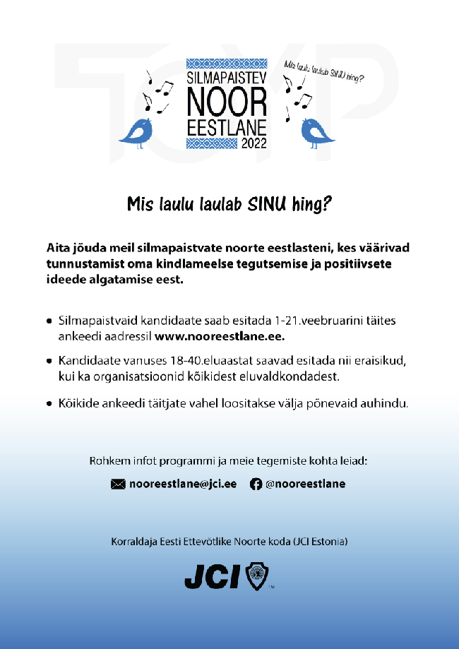 Ettevõtlike Noorte Koda tunnustab silmapaistvaid Eestimaa noori 21. veebruarini oodatakse nominente "Silmapaistva Noore Eestlase" tunnustusprogrammi, mille eesmärk on tõsta...