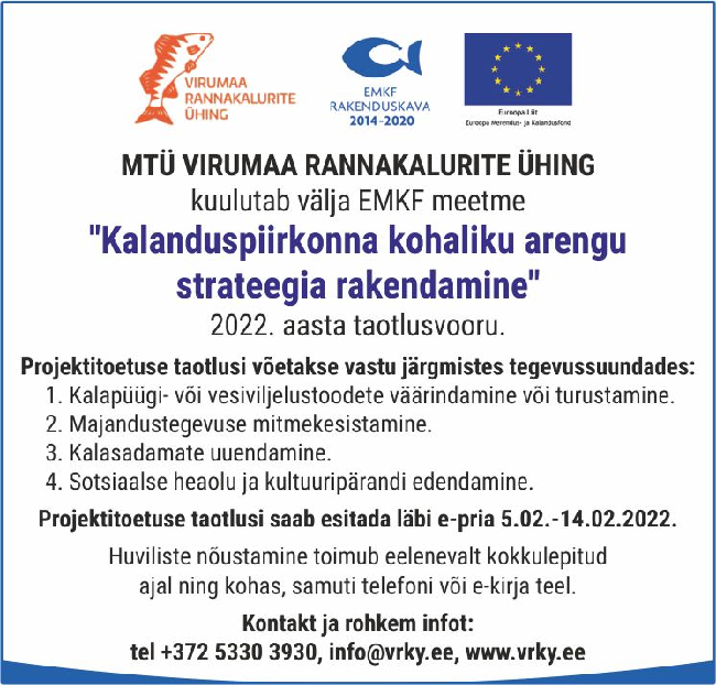 MTÜ Virumaa Rannakalurite Ühing kuulutab välja EMKF meetme "Kalanduspiirkonna kohaliku arengu strateegia rakendamine" 2022. aasta taotlusvooru. Projektitoetuse taotlusi...