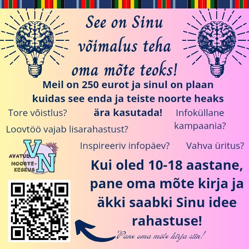 ⏩ Hei Sina noor, kes Sa oled 10-18-aastane ning tegutsed Viru-Nigula vallas! ⏪ Oled kunagi mõelnud, et tahaks korraldada teistele noortele mõnda sündmust või võistlust või kampaaniat või...