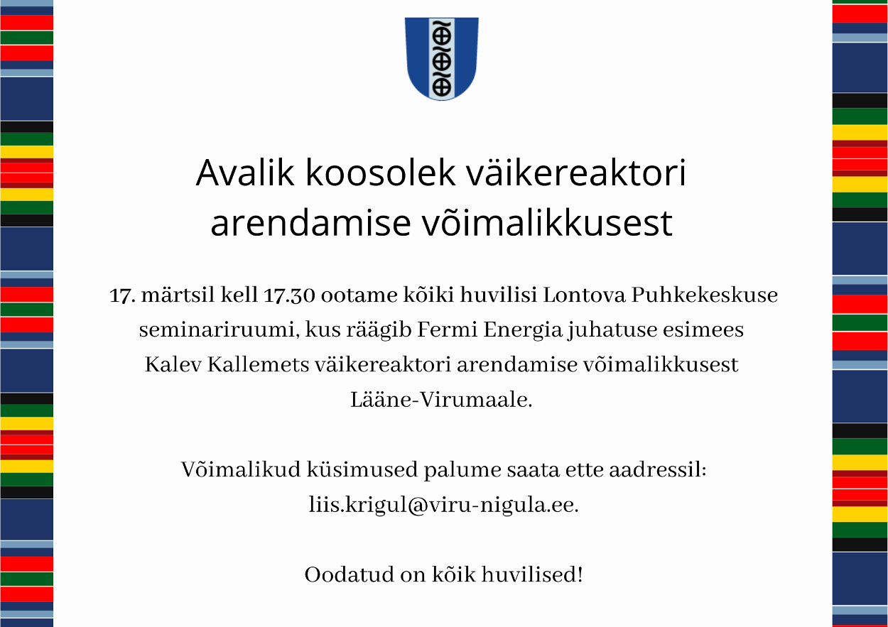 17. märtsil kell 17.30 ootame kõiki huvilisi Lontova Puhkekeskuse seminariruumi, kus räägib Fermi Energia juhatuse esimees Kalev Kallemets väikereaktori arendamise võimalikkusest Lääne-Virumaale.