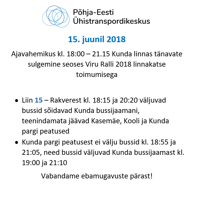 Alates 01. juunist 2018 Liinid 15, 26, 28, 41, 42, 65 lähevad üle suvistele sõidugraafikutele. Liinid 6, 9 sõidavad alates 2. juunist koolivaheaaja graafikute järgi. ...