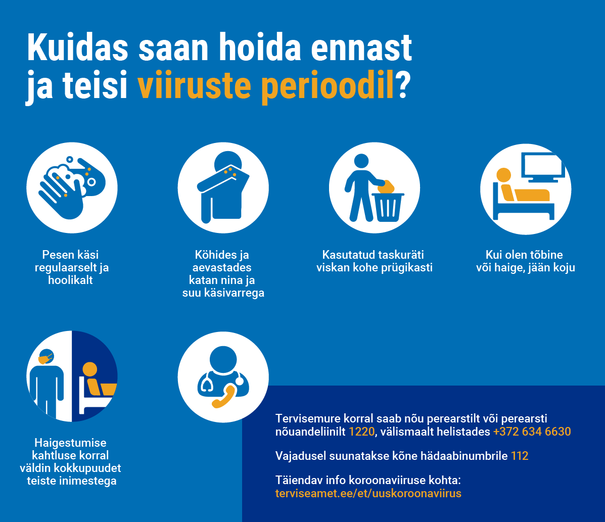 Meediaruumis on palju informatsiooni nii koroonaviiruse puhangu kui ka selle viiruse ennetusmeetmete kohta. Et teabes lihtsamini orienteeruda, soovitame kõige täpsemat ja ajakohasemat informatsiooni vaadata Terviseameti kodulehelt: www.terviseamet.ee/et/uuskoroonaviirus.