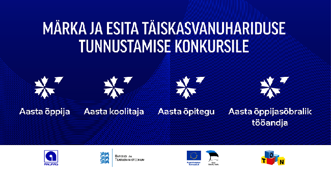 Kutsume üles 1. maist kuni 8. juunini esitama kandidaate täiskasvanuhariduse tunnustuskonkursile. Kandidaate saab esitada neljas kategoorias - aasta õppija, aasta õpitegu, aasta koolitaja ja...