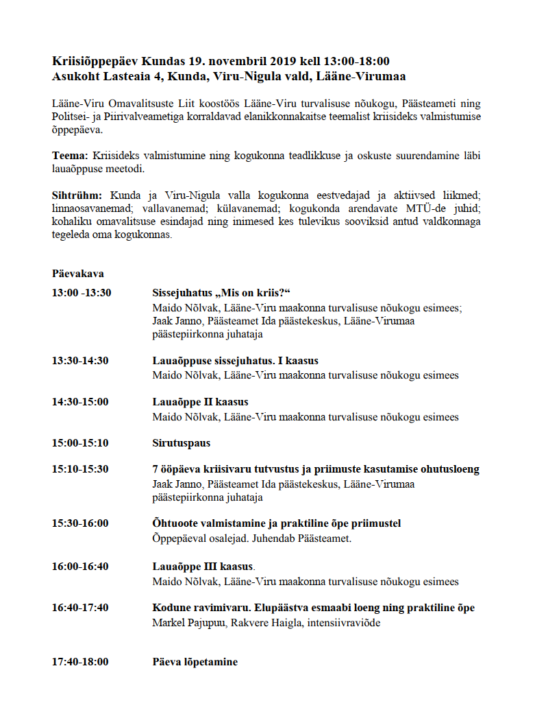 Kutse osalema kriisiõppepäeval Kundas 19. novembril 2019 kell 13:00-18:00 Asukoht Lasteaia 4, Kunda, Viru-Nigula vald, Lääne-Virumaa
