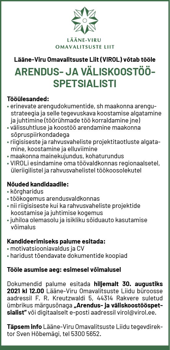 Lääne-Viru Omavalitsuste Liit (VIROL) võtab tööle arendus- ja väliskoostöö- spetsialisti