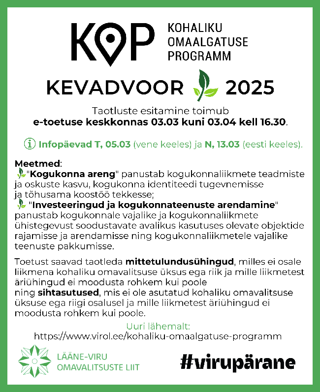 MTÜ Viru-Nigula valla toetusgrupp tuletab meelde, et lähenemas on 2025. aasta kevadvooru tähtaeg 1. märts. Taotlused tuleb esitada nimetatud kuupäeva sees aadressil toetusgrupp@viru-nigula.ee ....