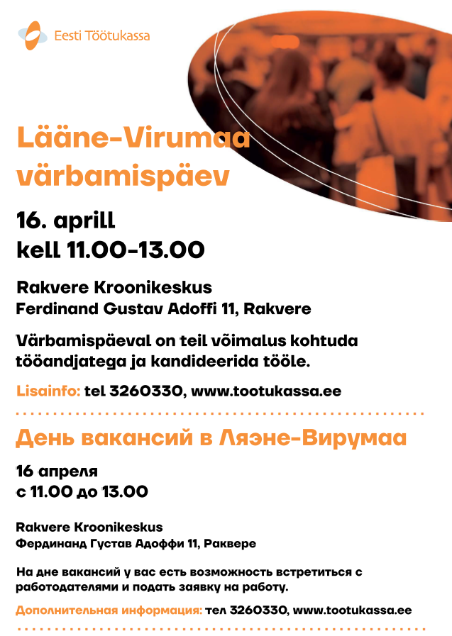 Eesti Töötukassa korraldab Rakvere Kroonikeskuses 16. aprillil kell 11.00 - 13.00 värbamispäeva, kus saavad kokku tööandjad ja töö otsijad. Osalemine on kõigile tasuta.