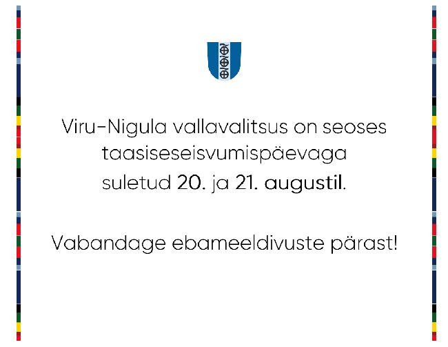 Viru-Nigula Vallavolikogu istung toimub kolmapäeval, 15.10.2025 algusega kell 17.00 Viru-Nigula rahvamajas, aadressil Kunda tee 8 Viru-Nigula alevikus. Päevakord: ...