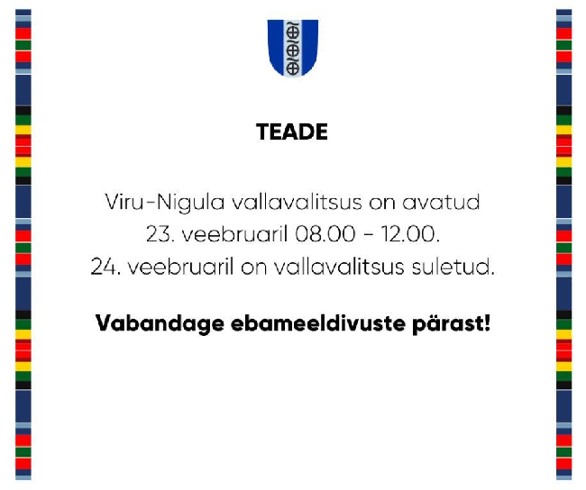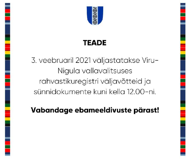 3. veebruaril 2021 väljastatakse Viru-Nigula vallavalitsuses rahvastikuregistri väljavõtteid ja sünnidokumente kuni kella 12-ni. Vabandame ebameeldivuste pärast!