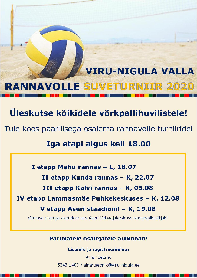 Algab Viru-Nigula valla rannavolle suveturniir. Mängud toimuvad valla erinevatel rannavolleväljakutel Mahu, Kunda ja Kalvi rannas, Lammasmäe Puhkekeskuses ning Aseri Vabaajakeskuse juures. ...