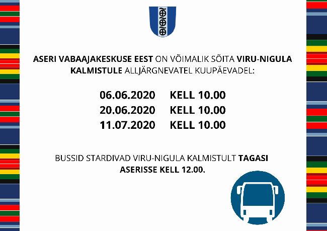 Aseri Vabaajakeskuse eest on võimalik sõita Viru-Nigula kalmistule alljärgnevatel kuupäevadel: 6.06.2020 kell 10.00 20.06.2020 kell 10.00 11.07.2020 kell 10.00 ...