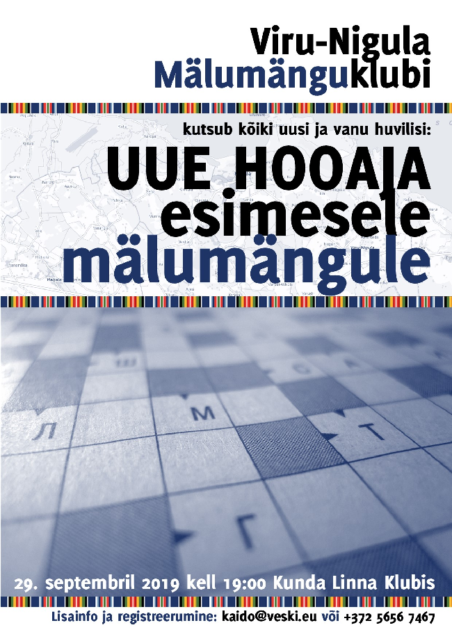 Viru-Nigula mälumänguklubi tänavune hooaeg alustab teisipäeval, 29. septembril kell 19 Kunda linna klubis. Korraldajad paluvad oma osalemisest eelnevalt teada anda: kaido@veski.eu või tel...